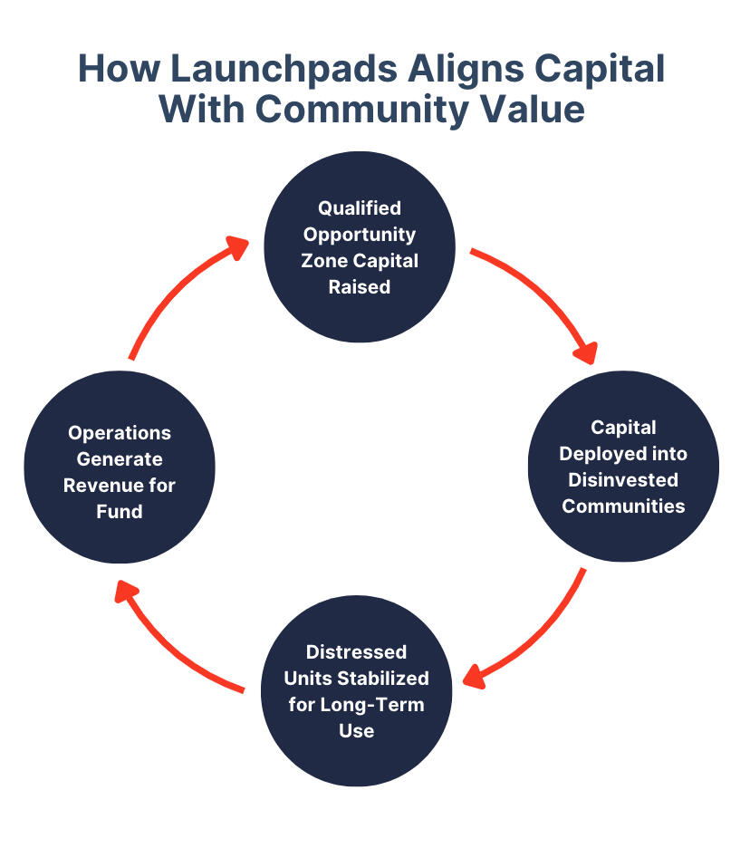 Launchpads addresses the rental housing gap in historically disinvested communities by acquiring and revitalizing distressed properties.Using Opportunity Zone capital, we deliver high-quality, affordable rentals while generating strong returns for impact-driven investors.